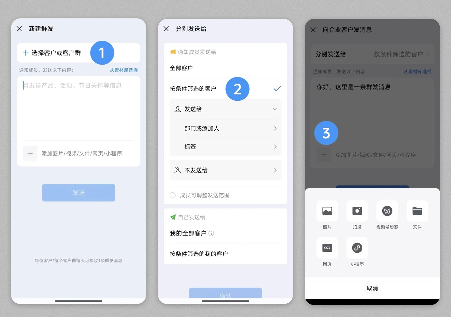 (1)频次与数量限制:客户个体每日最多接收1条来自同一员工/企业的群发消息;客户群每月最多接收4次企业群发,每日最多接收1条员工群发;单次群发客户上限为2万,客户群上限为200个。