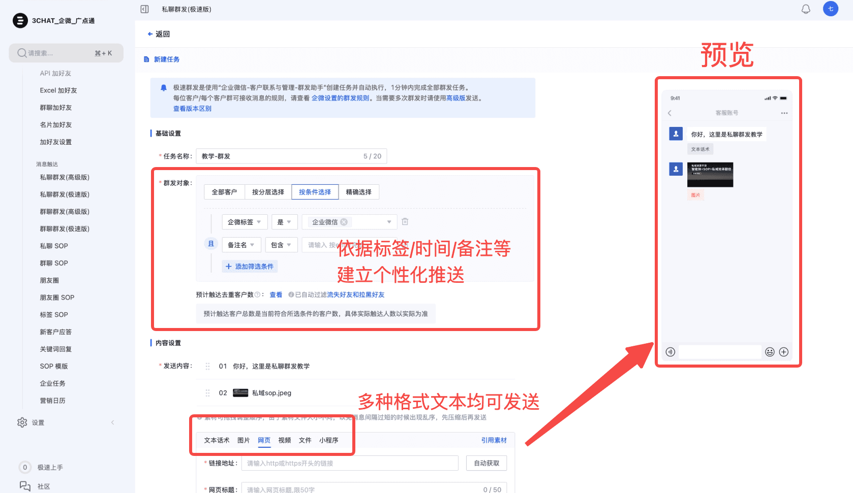 登录3Chat.ai后台,进入【私聊群发(极速版)】,点击“新建任务”,依次填写【任务名称】【群发对象】【内容】,所发送的内容在页面右上角可以预览,进行调整。