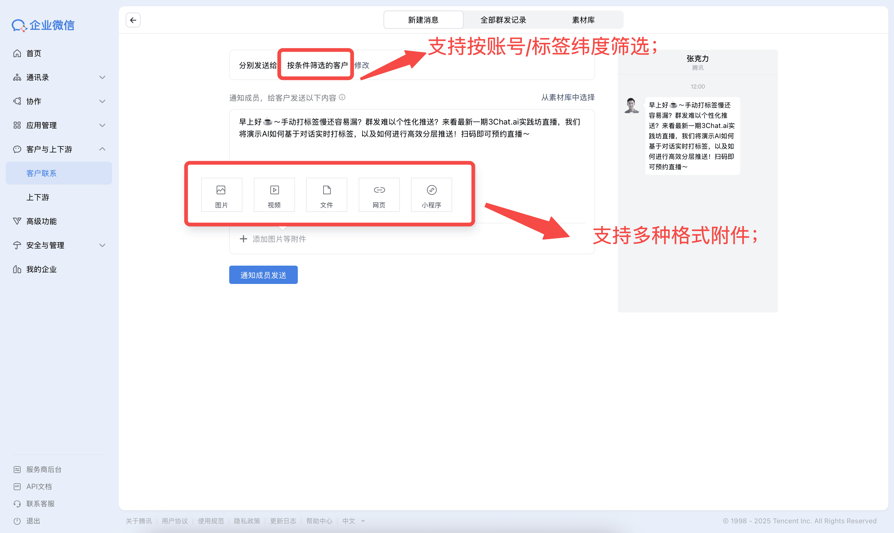 编辑文字、图片、视频等内容后,选择“通知成员发送给”,按照需要的标签纬度进行筛选,即可将群发任务下发给员工,由员工执行最终推送。