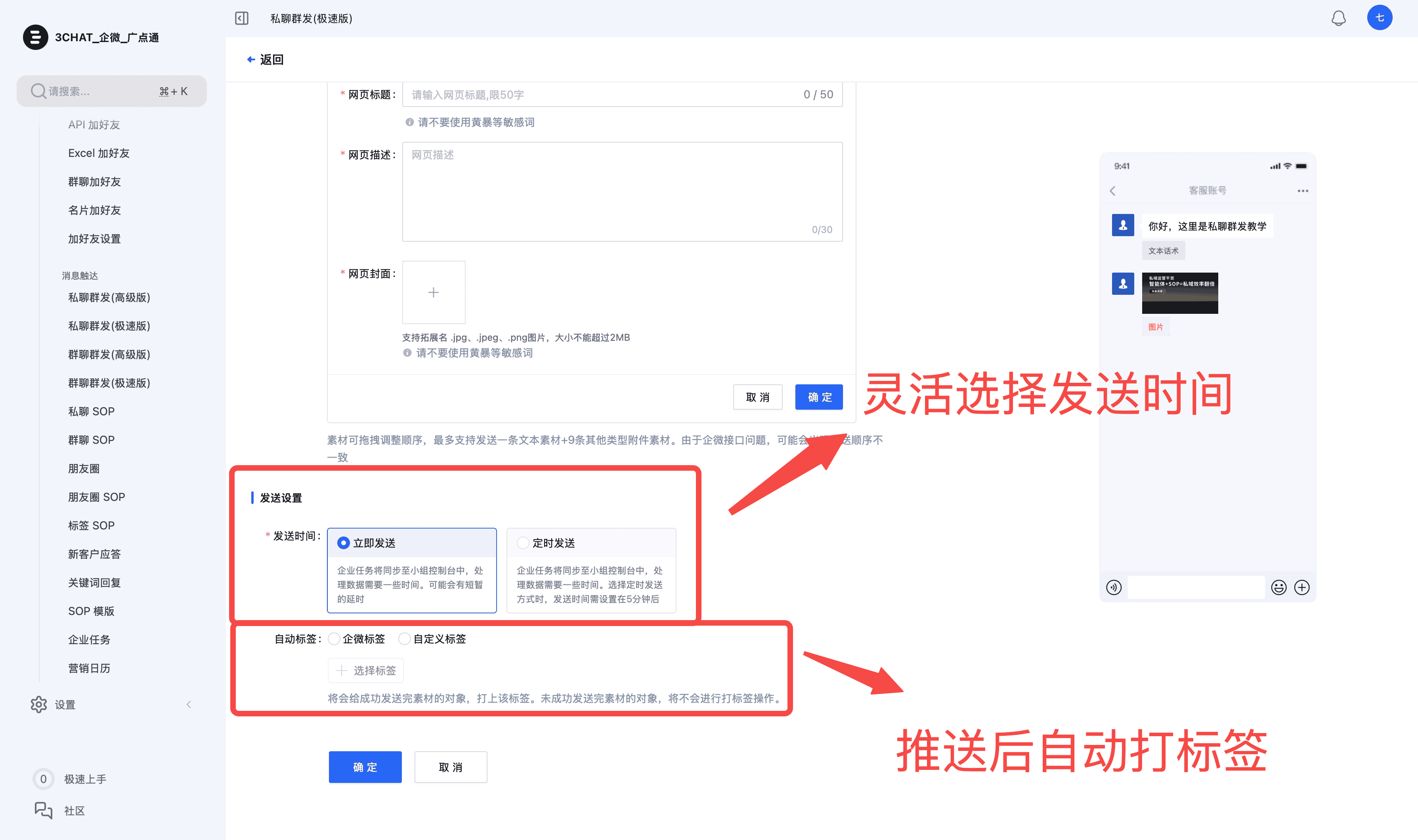 (1)突破频次与功能限制,灵活掌控运营节奏:3Chat.ai支持定时群发和周期群发,可提前编辑好内容,按照时间设置发送规则,无需手动重复操作;同时打破了企微官方的群发频次限制,可根据客户分层灵活设置触达频率,如高价值客户每周2次,兼顾触达效率与客户体验。
